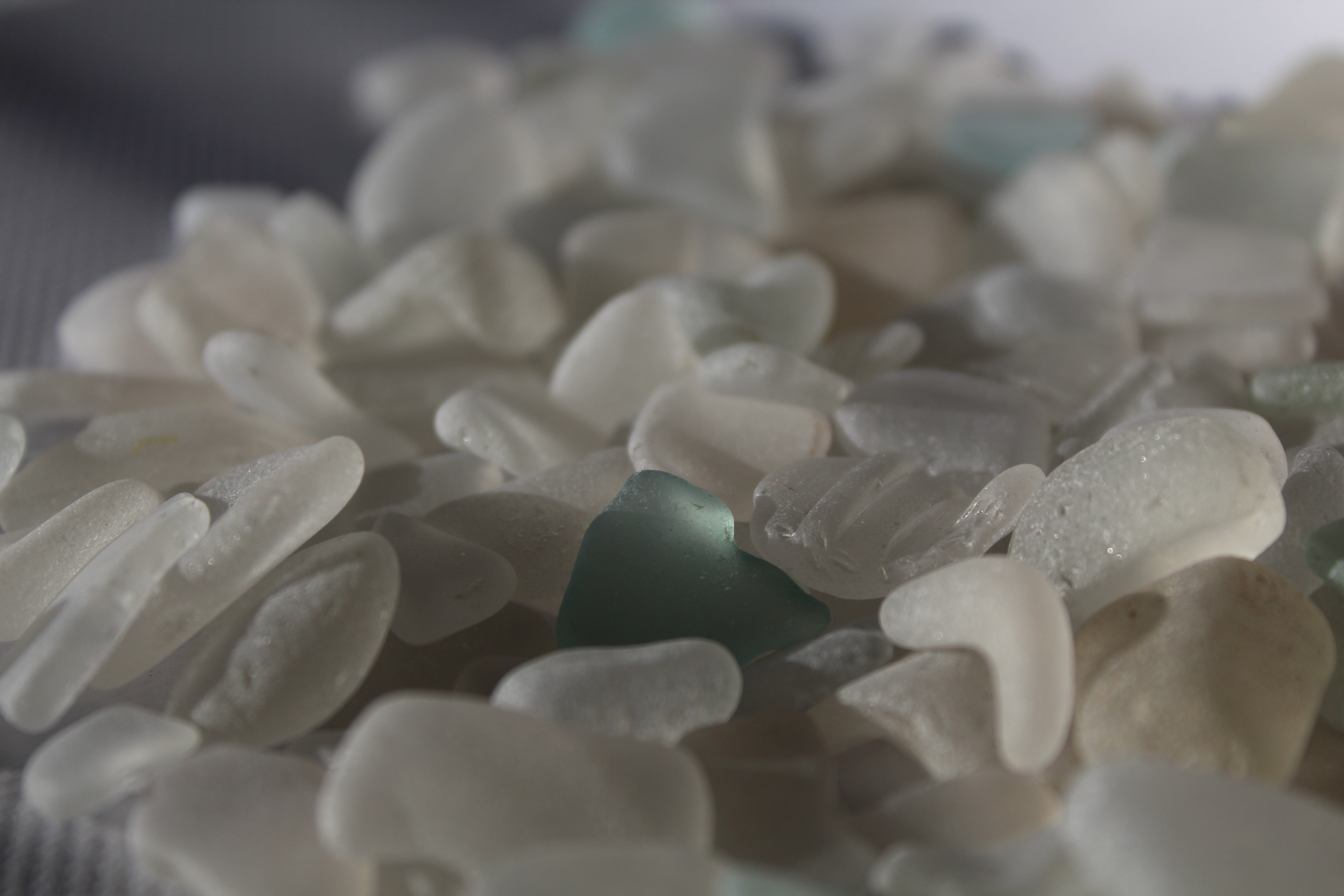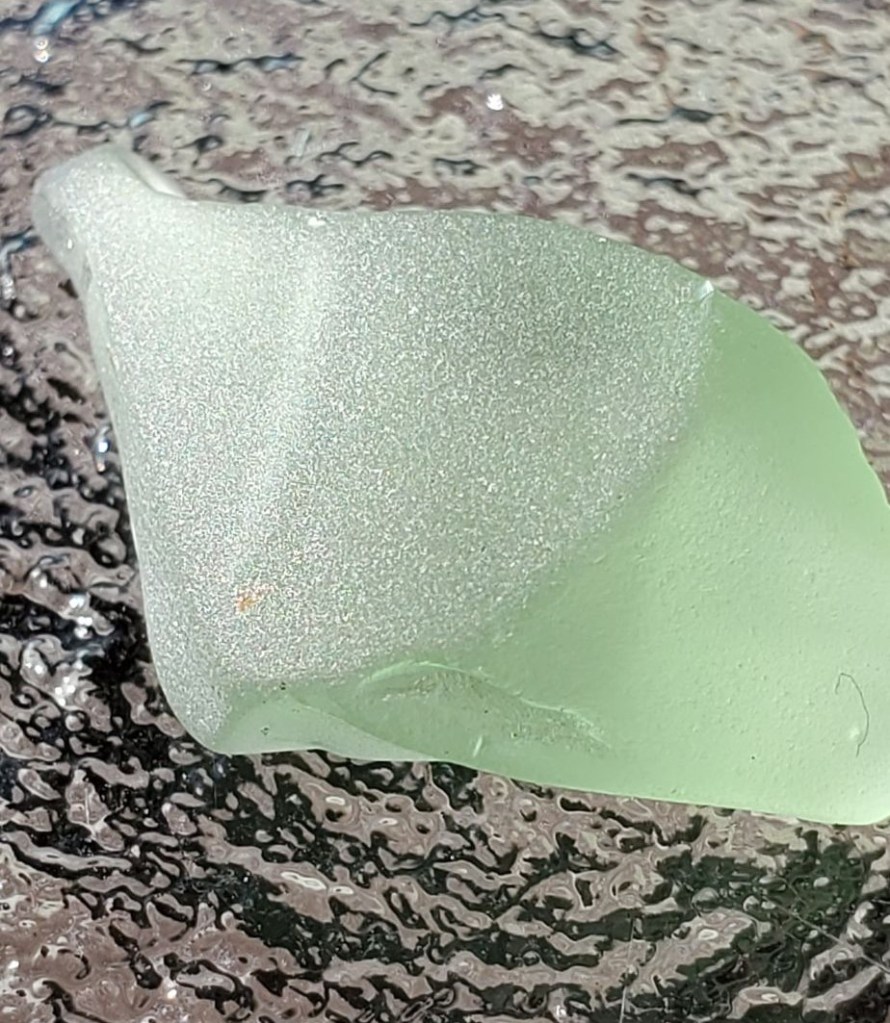 It can be found on almost any coastal shore, from large pieces to small, shades and patterns can vary, and brighter more vibrant colours are a rarity to find. For the avid sea glass hunter, the common finds are whites, browns, ambers, shades of greens and while some are older than others, the common colours are sought after as well frosted gems. The “Frost” as is most referred to, it the white haze that envelopes the various shades. This frost occurs as the glass is tumbled over time in the salt water, which then creates pits and dings from crashing against the other debris in the water. You can see the “C” marks the ocean debris makes in the glass.